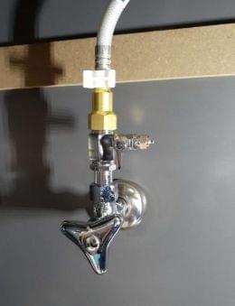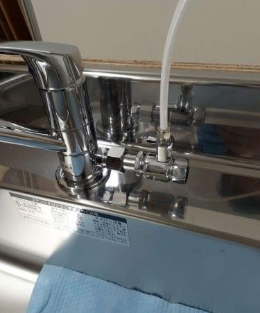 シンク下の収納(扉や引き出し)を開け、チューブがつながっている「銀色の金具」のレバーを90度回してください。